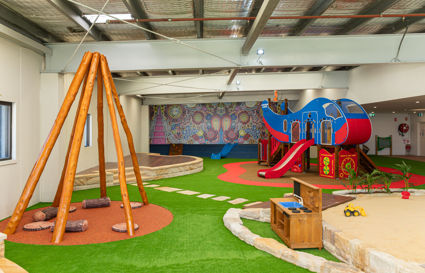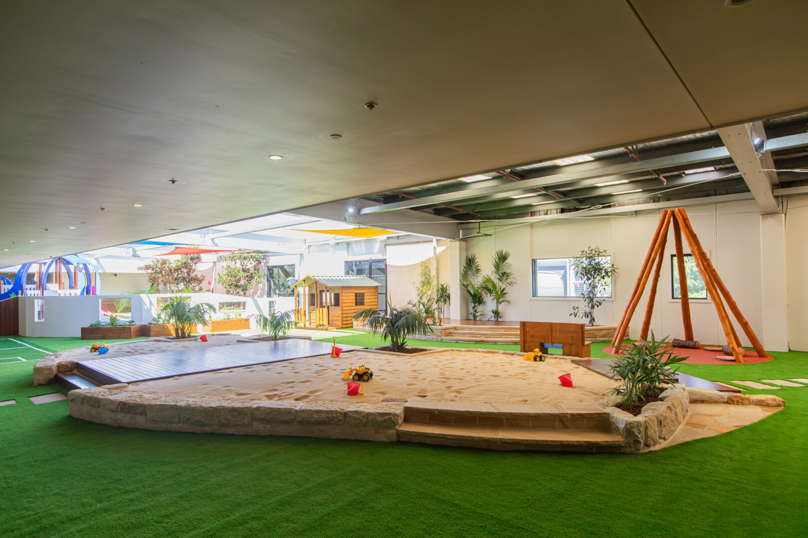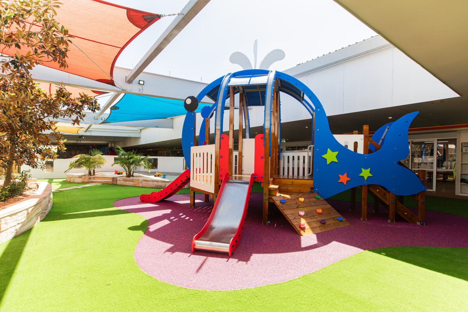 At our Alexandria childcare centre, children enjoy two large outdoor play areas designed to spark curiosity and confidence. The infant space (0–2 years) includes gardens, a sandpit, sensory walls, climbing equipment, soft play areas, water play, and a teepee—perfect for safe exploration. The older children’s space (2–6 years) offers a climbing wall, bikes, sandpit, water play, gardens, a dramatic play corner, and an art station.