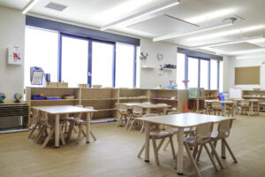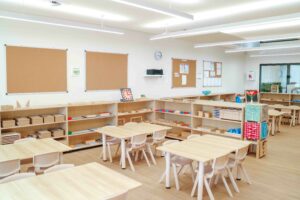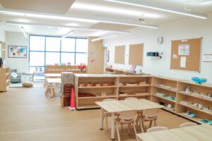 The daycare centre features a modern single-story design with four spacious Montessori classrooms. Each room is thoughtfully prepared with hands-on learning materials that match children’s interests and developmental needs, creating the ideal environment for growth and discovery.