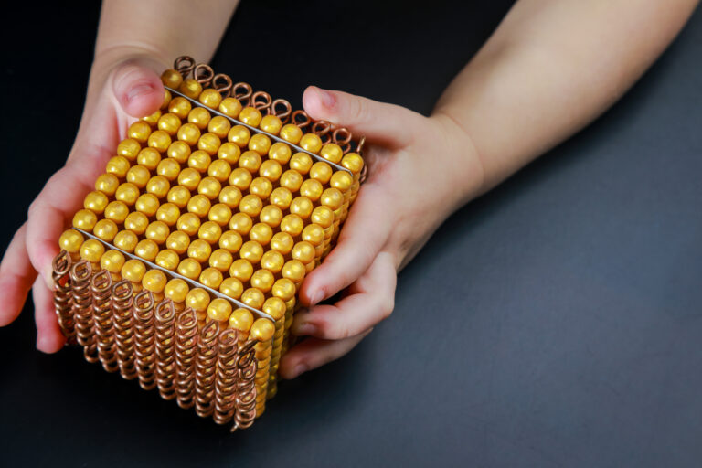 The Golden Beads materials are an essential tool in Montessori education, helping children understand the decimal system, place value, and basic mathematical operations.