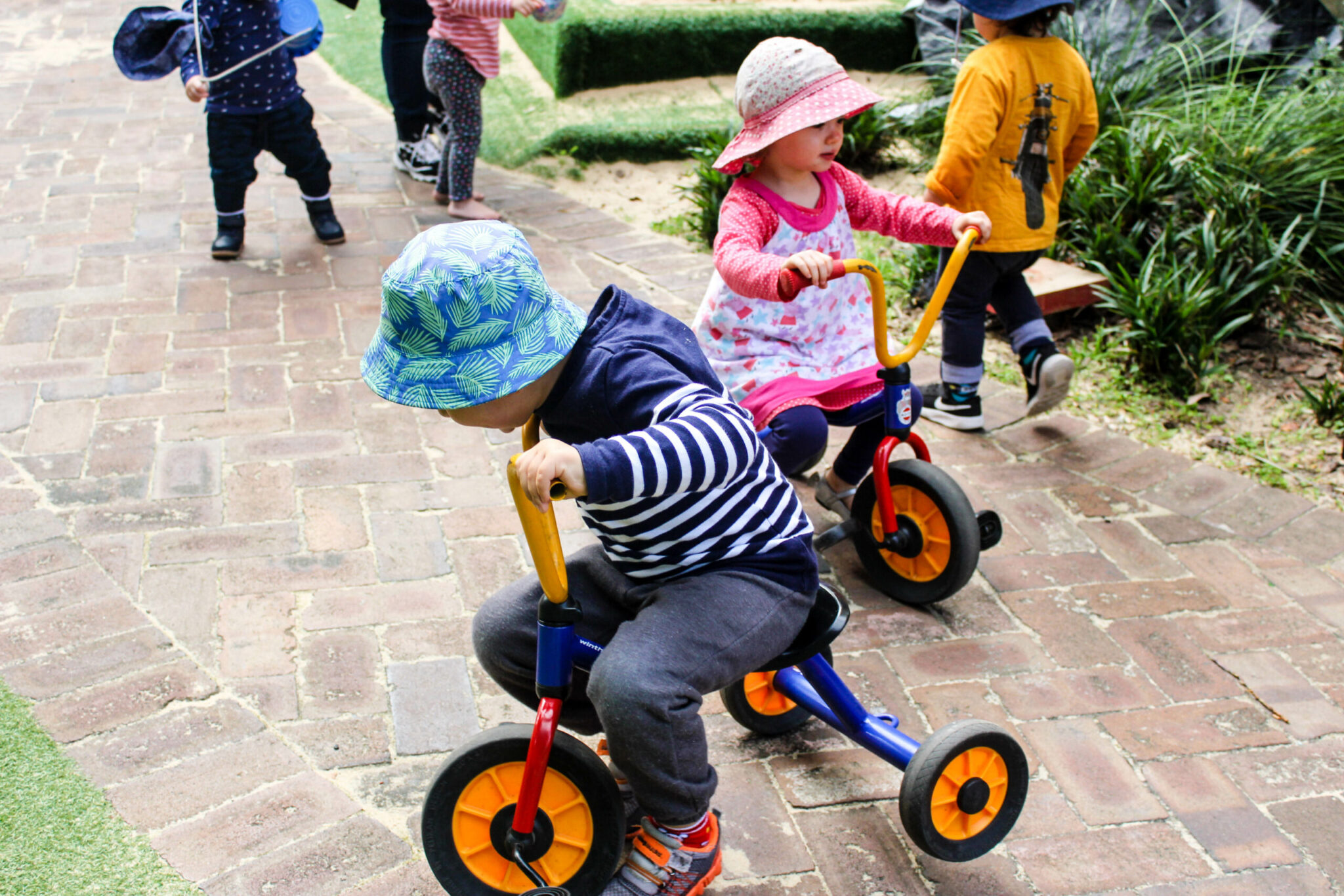 Through activities such as riding tricycles, swinging, and running, children increase their large muscle use. This increase in physical activity supports children’s gross motor development and overall health.